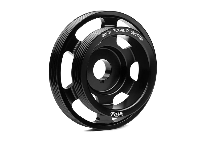 The Go Fast Bits Underdrive Pulley Kit features lightweight aluminum construction. This kit will include a lightweight crank pulley, power steering pulley, and an alternator pulley. These are direct replacements for the factory pulleys and the weight savings will allow for a faster engine response with faster revs.